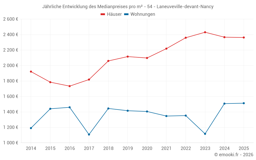 Der Durchschnittspreis auf den 18 Hausgeschäften der letzten 6 Monate in der Gemeinde Laneuveville-devant-Nancy betrug 2 362 € pro Quadratmeter für einen mittleren Immobilienwert von 228 500 €. Über diesen Zeitraum hinweg lagen 60% der Transaktionen zwischen 2 078 und 2 944 € pro Quadratmeter (vom 2. bis zum 8. Dezil).