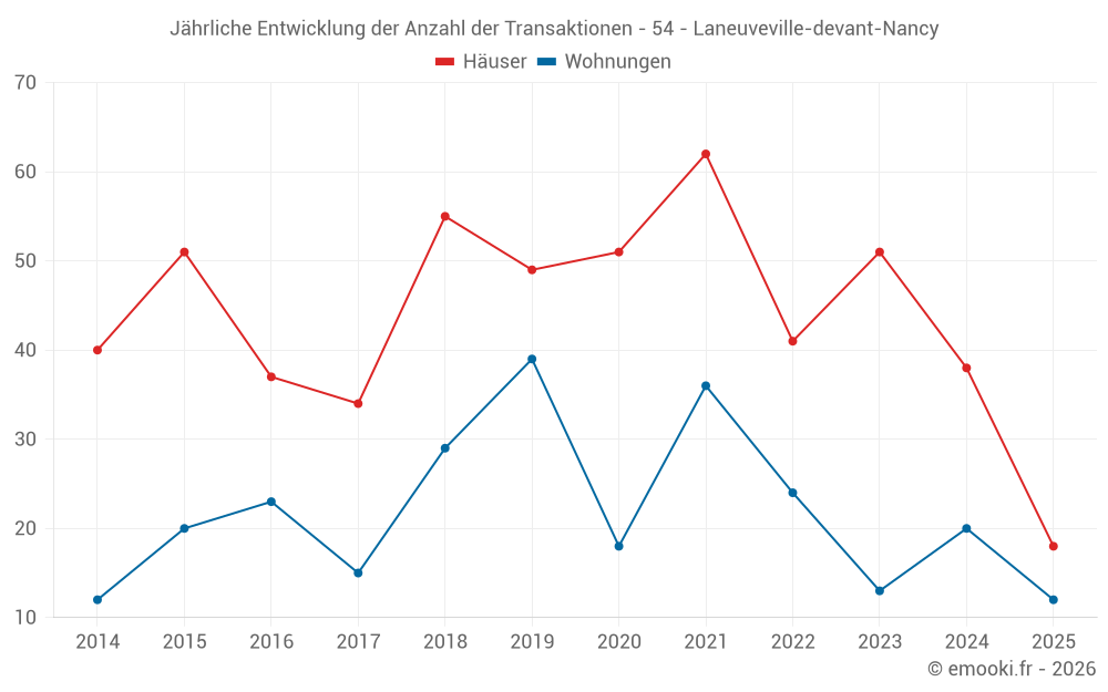 Der Durchschnittspreis auf den 27 Wohnungstransaktionen der letzten 12 Monate in der Gemeinde Laneuveville-devant-Nancy betrug 1 563 € pro Quadratmeter für einen mittleren Immobilienwert von 111 000 €. Über diesen Zeitraum hinweg lagen 60% der Transaktionen zwischen 1 306 und 2 196 € pro Quadratmeter (vom 2. bis zum 8. Dezil).