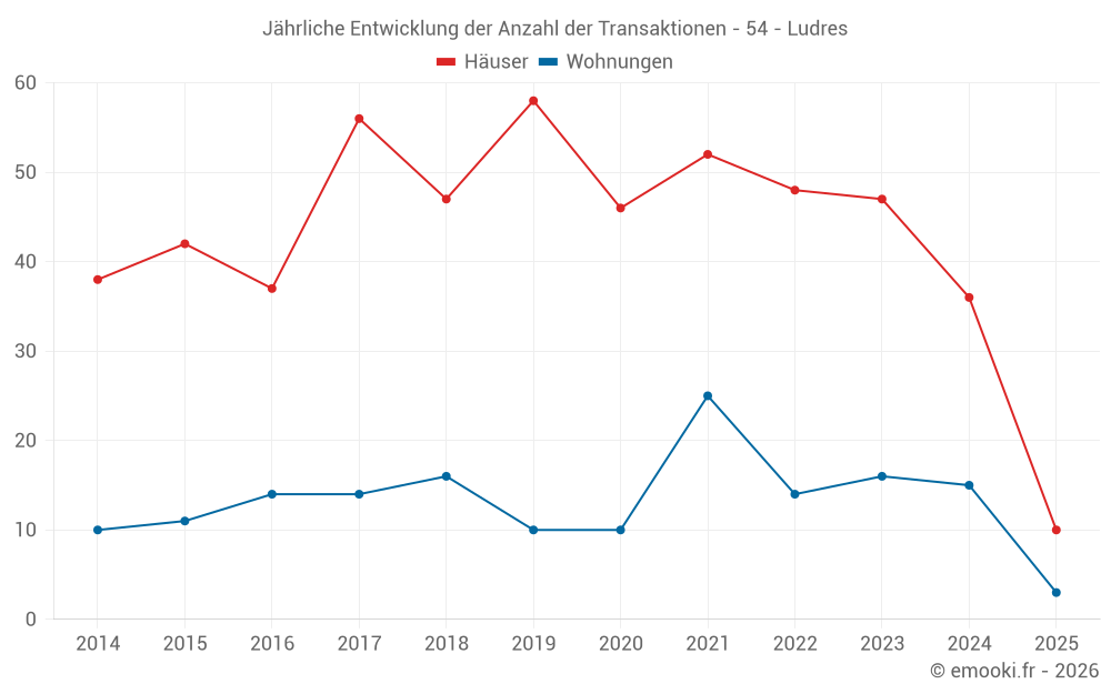 Der Durchschnittspreis auf den 33 Hausgeschäften der letzten 12 Monate in der Gemeinde Ludres betrug 2 463 € pro Quadratmeter für einen mittleren Immobilienwert von 245 000 €. Über diesen Zeitraum hinweg lagen 60% der Transaktionen zwischen 2 128 und 2 856 € pro Quadratmeter (vom 2. bis zum 8. Dezil).