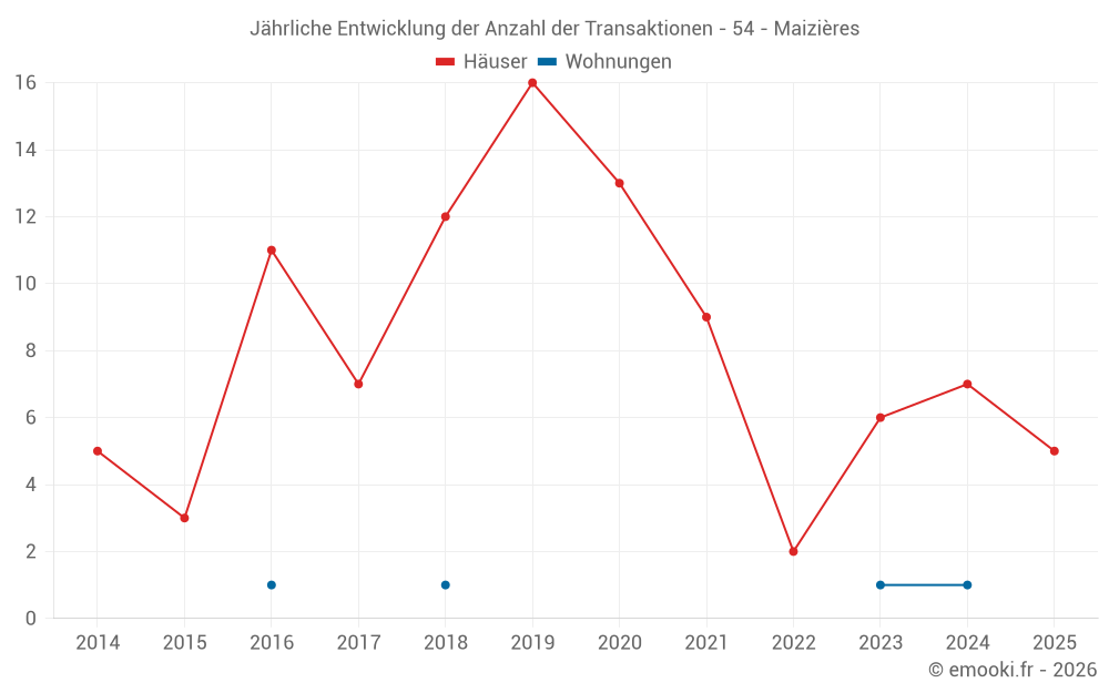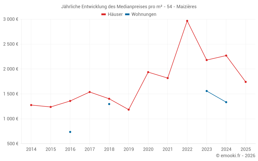 Der Durchschnittspreis auf den 14 Hausgeschäften der letzten 24 Monate in der Gemeinde Maizières betrug 1 924 € pro Quadratmeter für einen mittleren Immobilienwert von 230 385 €. Über diesen Zeitraum hinweg lagen 60% der Transaktionen zwischen 1 366 und 2 432 € pro Quadratmeter (vom 2. bis zum 8. Dezil).