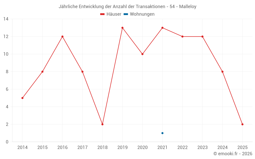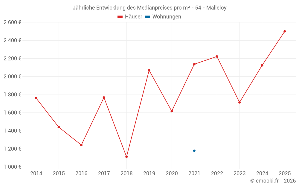 Der Durchschnittspreis auf den 18 Hausgeschäften der letzten 24 Monate in der Gemeinde Malleloy betrug 1 928 € pro Quadratmeter für einen mittleren Immobilienwert von 198 000 €. Über diesen Zeitraum hinweg lagen 60% der Transaktionen zwischen 1 399 und 2 449 € pro Quadratmeter (vom 2. bis zum 8. Dezil).