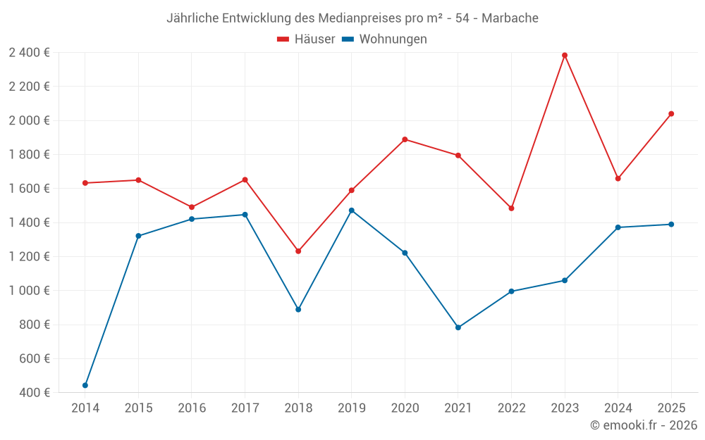 Der Durchschnittspreis auf den 14 Wohnungstransaktionen der letzten 24 Monate in der Gemeinde Marbache betrug 1 238 € pro Quadratmeter für einen mittleren Immobilienwert von 121 325 €. Über diesen Zeitraum hinweg lagen 60% der Transaktionen zwischen 904 und 1 612 € pro Quadratmeter (vom 2. bis zum 8. Dezil).