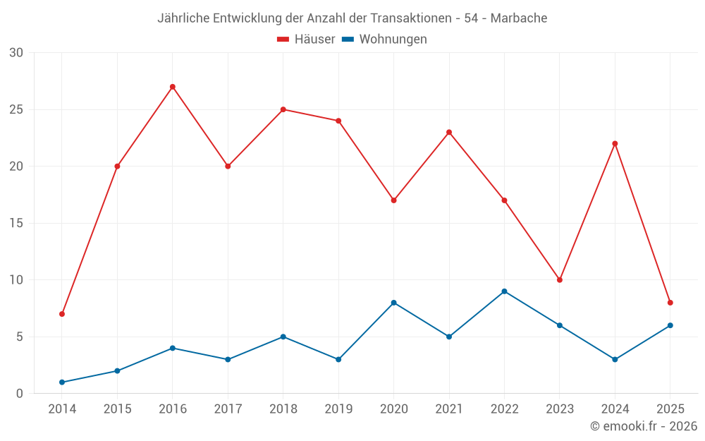 Der Durchschnittspreis auf den 25 Hausgeschäften der letzten 12 Monate in der Gemeinde Marbache betrug 1 869 € pro Quadratmeter für einen mittleren Immobilienwert von 166 250 €. Über diesen Zeitraum hinweg lagen 60% der Transaktionen zwischen 1 197 und 2 333 € pro Quadratmeter (vom 2. bis zum 8. Dezil).