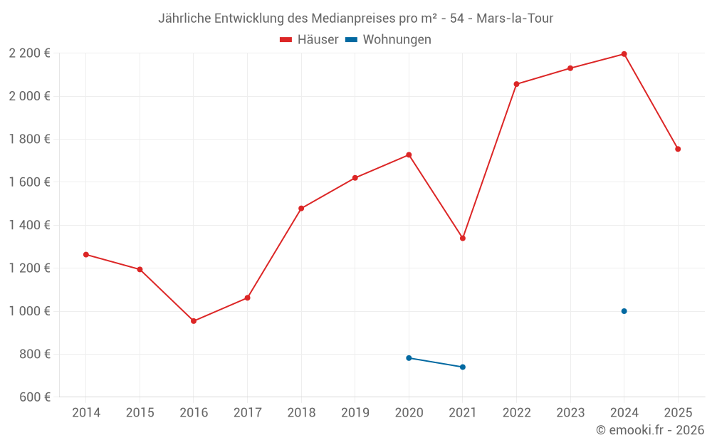 Der Durchschnittspreis auf den 17 Hausgeschäften der letzten 24 Monate in der Gemeinde Mars-la-Tour betrug 1 824 € pro Quadratmeter für einen mittleren Immobilienwert von 210 000 €. Über diesen Zeitraum hinweg lagen 60% der Transaktionen zwischen 1 414 und 2 367 € pro Quadratmeter (vom 2. bis zum 8. Dezil).