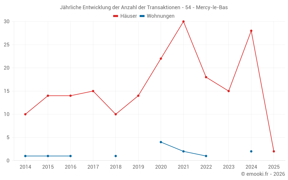 Der Durchschnittspreis auf den 20 Hausgeschäften der letzten 12 Monate in der Gemeinde Mercy-le-Bas betrug 1 830 € pro Quadratmeter für einen mittleren Immobilienwert von 148 825 €. Über diesen Zeitraum hinweg lagen 60% der Transaktionen zwischen 1 279 und 2 416 € pro Quadratmeter (vom 2. bis zum 8. Dezil).