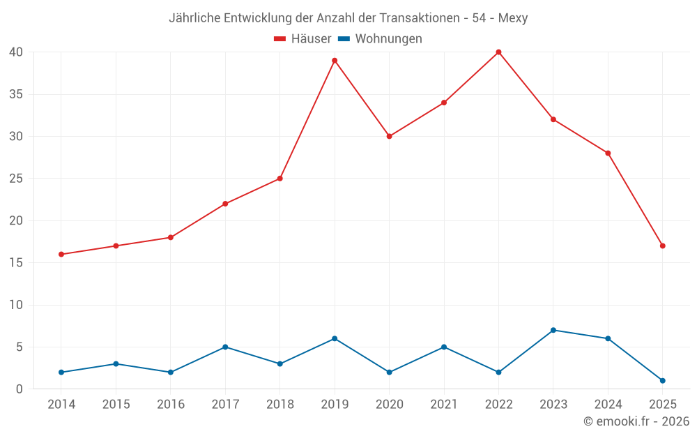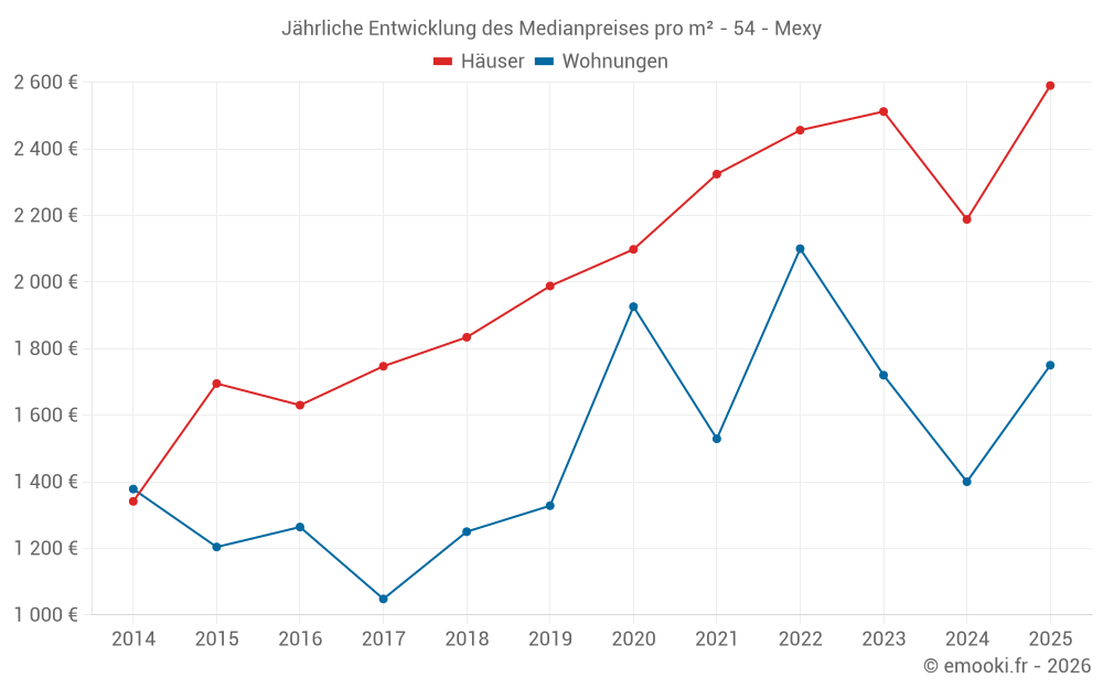 Der Durchschnittspreis auf den 31 Hausgeschäften der letzten 12 Monate in der Gemeinde Mexy betrug 2 343 € pro Quadratmeter für einen mittleren Immobilienwert von 213 800 €. Über diesen Zeitraum hinweg lagen 60% der Transaktionen zwischen 1 921 und 3 077 € pro Quadratmeter (vom 2. bis zum 8. Dezil).