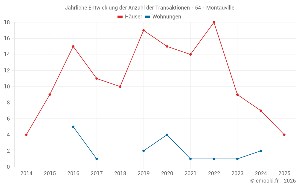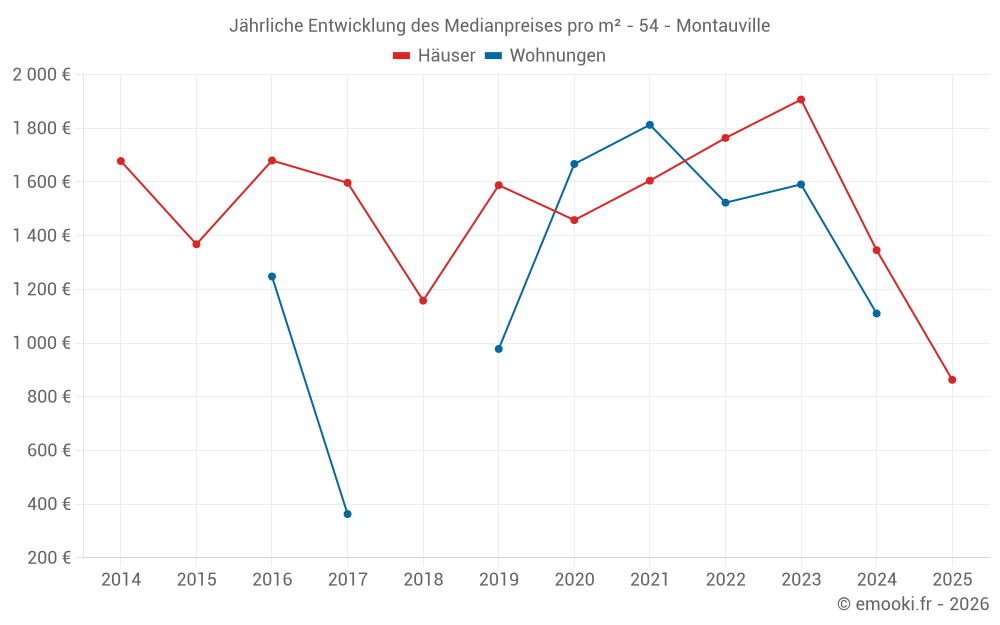Der Durchschnittspreis auf den 18 Hausgeschäften der letzten 24 Monate in der Gemeinde Montauville betrug 1 442 € pro Quadratmeter für einen mittleren Immobilienwert von 162 500 €. Über diesen Zeitraum hinweg lagen 60% der Transaktionen zwischen 771 und 2 061 € pro Quadratmeter (vom 2. bis zum 8. Dezil).