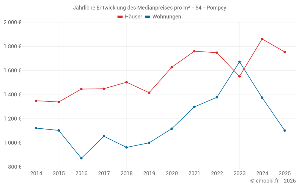 Der Durchschnittspreis auf den 29 Hausgeschäften der letzten 12 Monate in der Gemeinde Pompey betrug 1 862 € pro Quadratmeter für einen mittleren Immobilienwert von 156 440 €. Über diesen Zeitraum hinweg lagen 60% der Transaktionen zwischen 1 436 und 2 214 € pro Quadratmeter (vom 2. bis zum 8. Dezil).