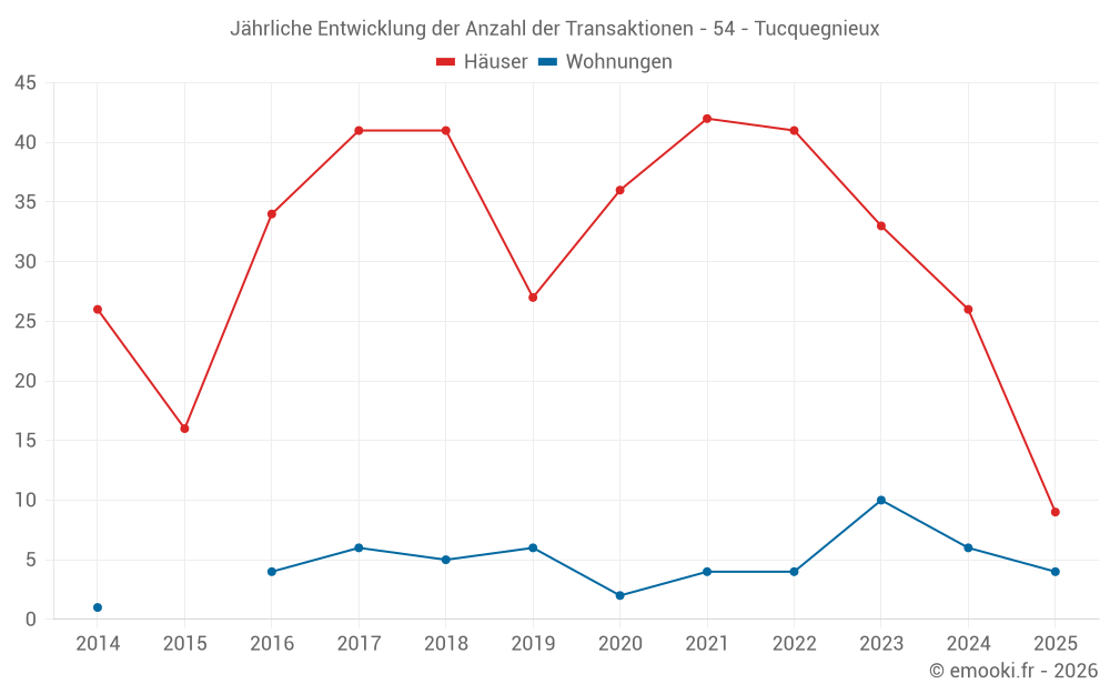 Der Durchschnittspreis auf den 18 Wohnungstransaktionen der letzten 24 Monate in der Gemeinde Tucquegnieux betrug 1 160 € pro Quadratmeter für einen mittleren Immobilienwert von 71 400 €. Über diesen Zeitraum hinweg lagen 60% der Transaktionen zwischen 613 und 1 408 € pro Quadratmeter (vom 2. bis zum 8. Dezil).