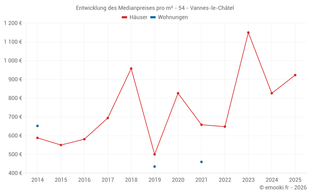 Der Durchschnittspreis auf den 14 Hausgeschäften der letzten 24 Monate in der Gemeinde Vannes-le-Châtel betrug 948 € pro Quadratmeter für einen mittleren Immobilienwert von 90 500 €. Über diesen Zeitraum hinweg lagen 60% der Transaktionen zwischen 649 und 1 225 € pro Quadratmeter (vom 2. bis zum 8. Dezil).