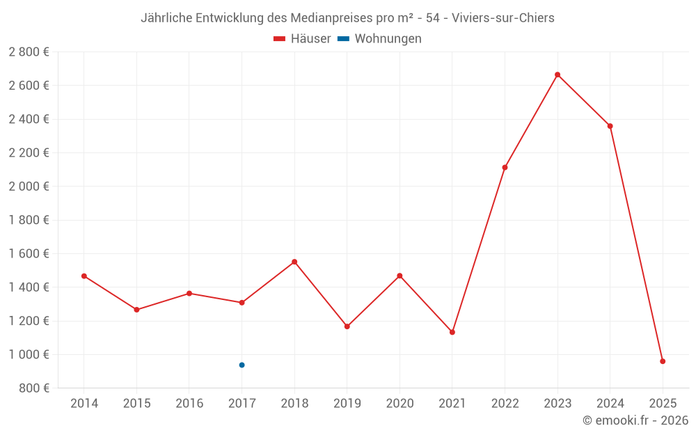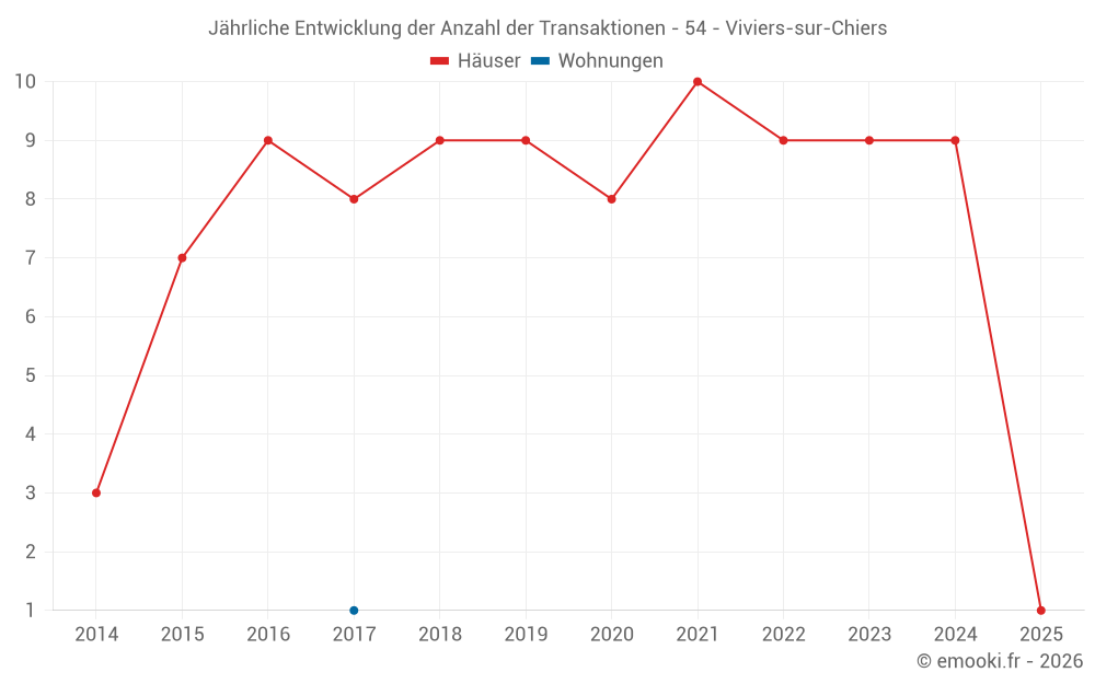 Der Durchschnittspreis auf den 15 Hausgeschäften der letzten 24 Monate in der Gemeinde Viviers-sur-Chiers betrug 2 289 € pro Quadratmeter für einen mittleren Immobilienwert von 245 300 €. Über diesen Zeitraum hinweg lagen 60% der Transaktionen zwischen 1 300 und 2 790 € pro Quadratmeter (vom 2. bis zum 8. Dezil).