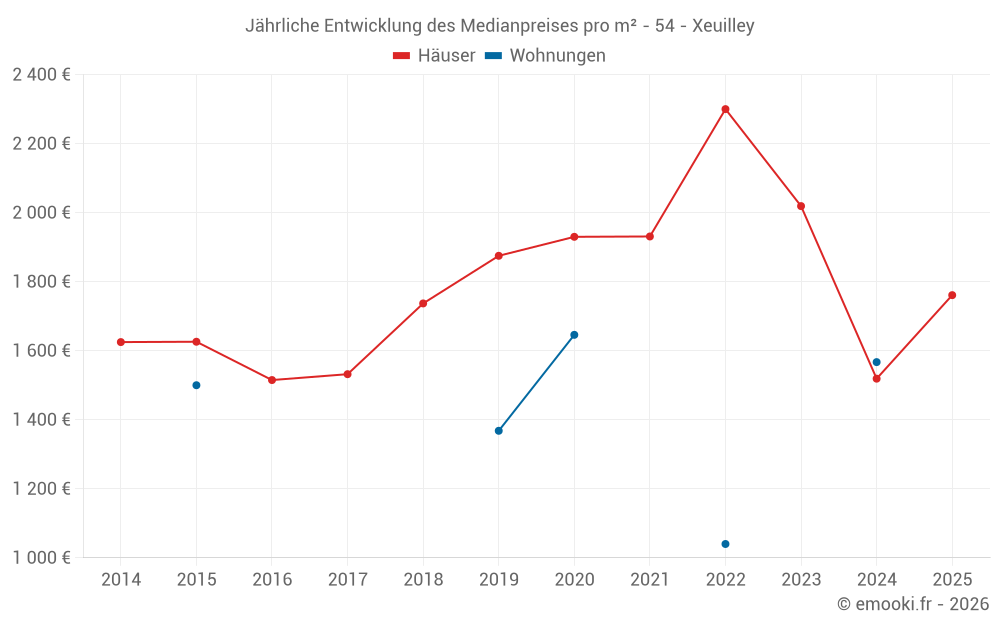 Der Durchschnittspreis auf den 17 Hausgeschäften der letzten 24 Monate in der Gemeinde Xeuilley betrug 1 615 € pro Quadratmeter für einen mittleren Immobilienwert von 149 940 €. Über diesen Zeitraum hinweg lagen 60% der Transaktionen zwischen 1 196 und 2 615 € pro Quadratmeter (vom 2. bis zum 8. Dezil).