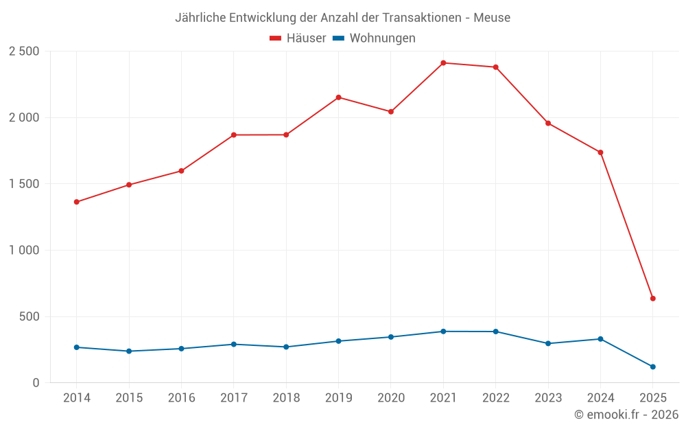 Der Durchschnittspreis auf den 121 Wohnungstransaktionen der letzten 6 Monate im Meuse-Departement betrug 903 € pro Quadratmeter für einen mittleren Immobilienwert von 77 750 €. Über diesen Zeitraum hinweg lagen 60% der Transaktionen zwischen 522 und 1 354 € pro Quadratmeter (vom 2. bis zum 8. Dezil).