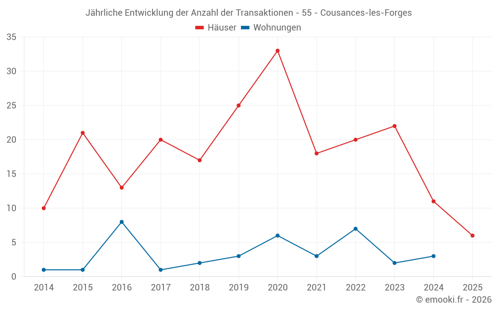 Der Durchschnittspreis auf den 31 Hausgeschäften der letzten 24 Monate in der Gemeinde Cousances-les-Forges betrug 727 € pro Quadratmeter für einen mittleren Immobilienwert von 76 000 €. Über diesen Zeitraum hinweg lagen 60% der Transaktionen zwischen 485 und 1 183 € pro Quadratmeter (vom 2. bis zum 8. Dezil).