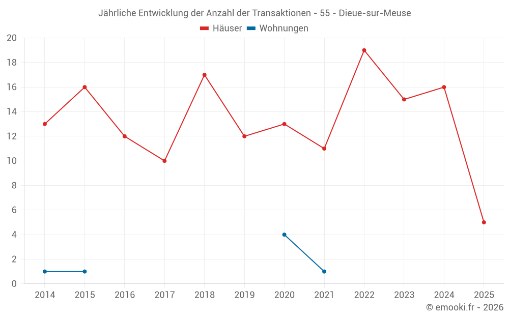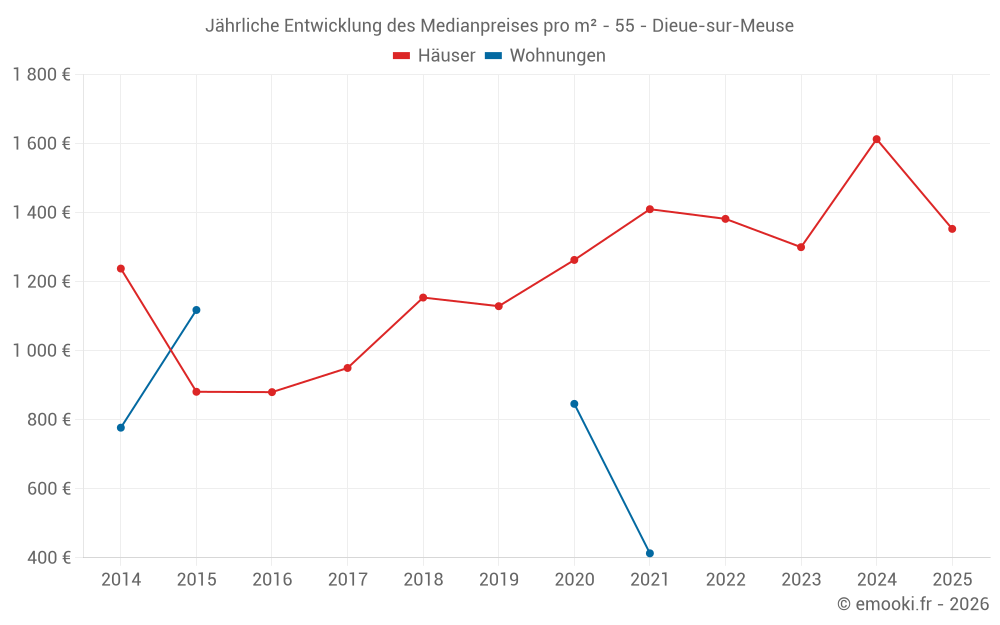 Der Durchschnittspreis auf den 29 Hausgeschäften der letzten 24 Monate in der Gemeinde Dieue-sur-Meuse betrug 1 390 € pro Quadratmeter für einen mittleren Immobilienwert von 148 000 €. Über diesen Zeitraum hinweg lagen 60% der Transaktionen zwischen 867 und 1 759 € pro Quadratmeter (vom 2. bis zum 8. Dezil).