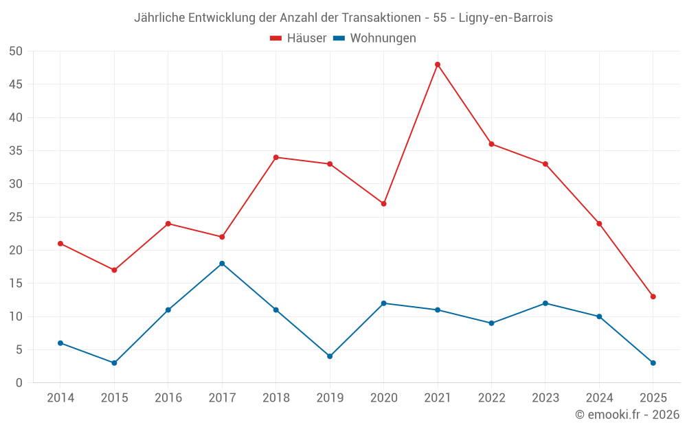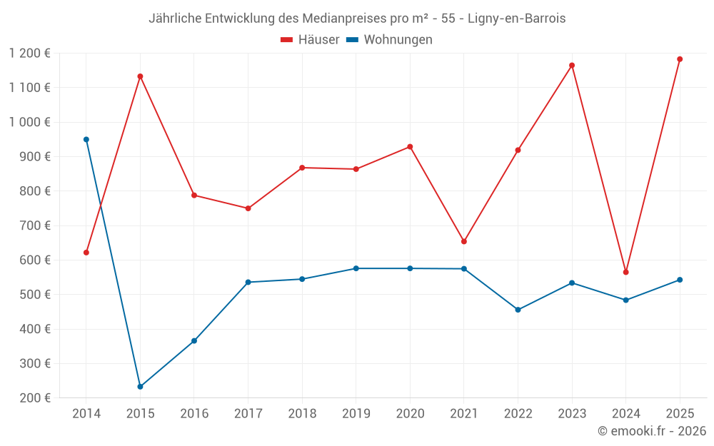 Der Durchschnittspreis auf den 27 Hausgeschäften der letzten 12 Monate in der Gemeinde Ligny-en-Barrois betrug 1 183 € pro Quadratmeter für einen mittleren Immobilienwert von 99 000 €. Über diesen Zeitraum hinweg lagen 60% der Transaktionen zwischen 519 und 1 646 € pro Quadratmeter (vom 2. bis zum 8. Dezil).