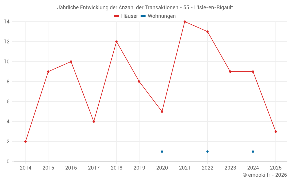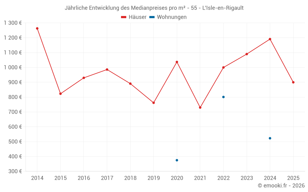 Der Durchschnittspreis auf den 15 Hausgeschäften der letzten 24 Monate in der Gemeinde L'Isle-en-Rigault betrug 1 105 € pro Quadratmeter für einen mittleren Immobilienwert von 90 000 €. Über diesen Zeitraum hinweg lagen 60% der Transaktionen zwischen 662 und 1 315 € pro Quadratmeter (vom 2. bis zum 8. Dezil).