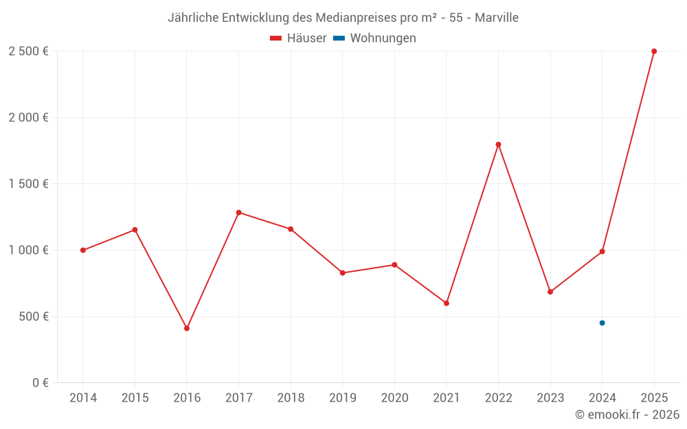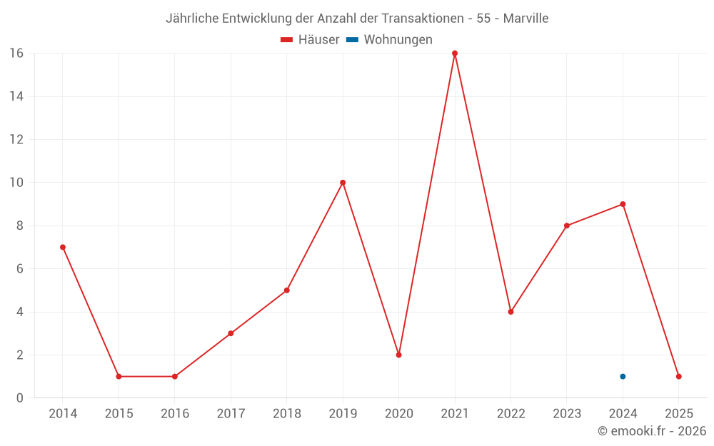 Der Durchschnittspreis auf den 14 Hausgeschäften der letzten 24 Monate in der Gemeinde Marville betrug 870 € pro Quadratmeter für einen mittleren Immobilienwert von 99 500 €. Über diesen Zeitraum hinweg lagen 60% der Transaktionen zwischen 336 und 1 382 € pro Quadratmeter (vom 2. bis zum 8. Dezil).