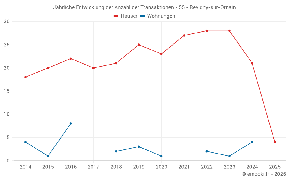 Der Durchschnittspreis auf den 34 Hausgeschäften der letzten 24 Monate in der Gemeinde Revigny-sur-Ornain betrug 1 045 € pro Quadratmeter für einen mittleren Immobilienwert von 118 500 €. Über diesen Zeitraum hinweg lagen 60% der Transaktionen zwischen 861 und 1 498 € pro Quadratmeter (vom 2. bis zum 8. Dezil).