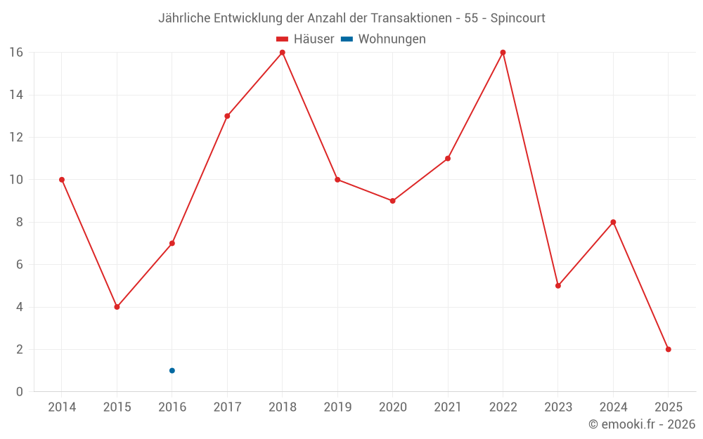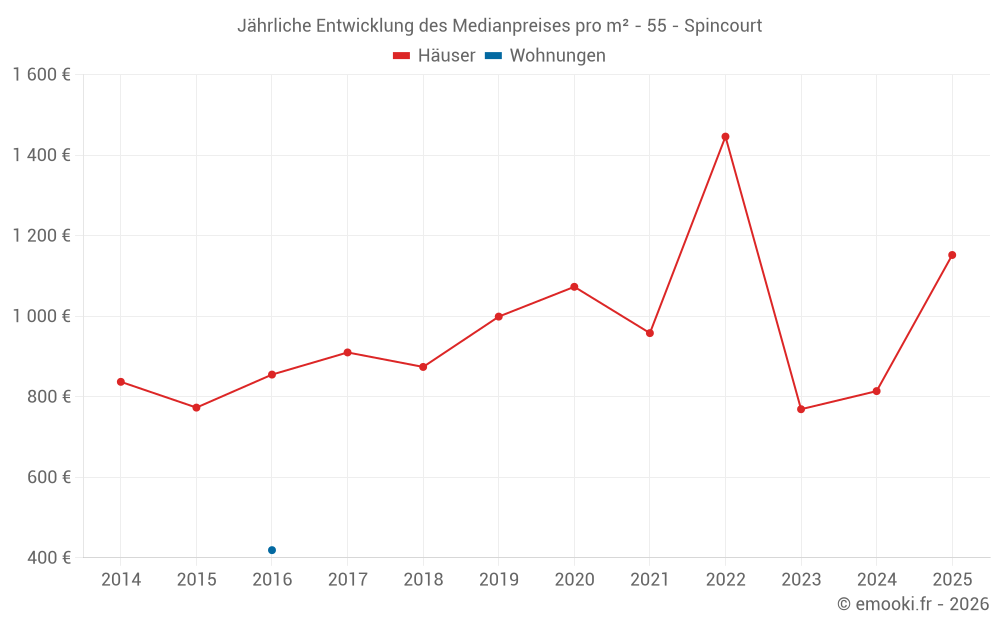 Der Durchschnittspreis auf den 14 Hausgeschäften der letzten 24 Monate in der Gemeinde Spincourt betrug 801 € pro Quadratmeter für einen mittleren Immobilienwert von 122 500 €. Über diesen Zeitraum hinweg lagen 60% der Transaktionen zwischen 588 und 1 754 € pro Quadratmeter (vom 2. bis zum 8. Dezil).