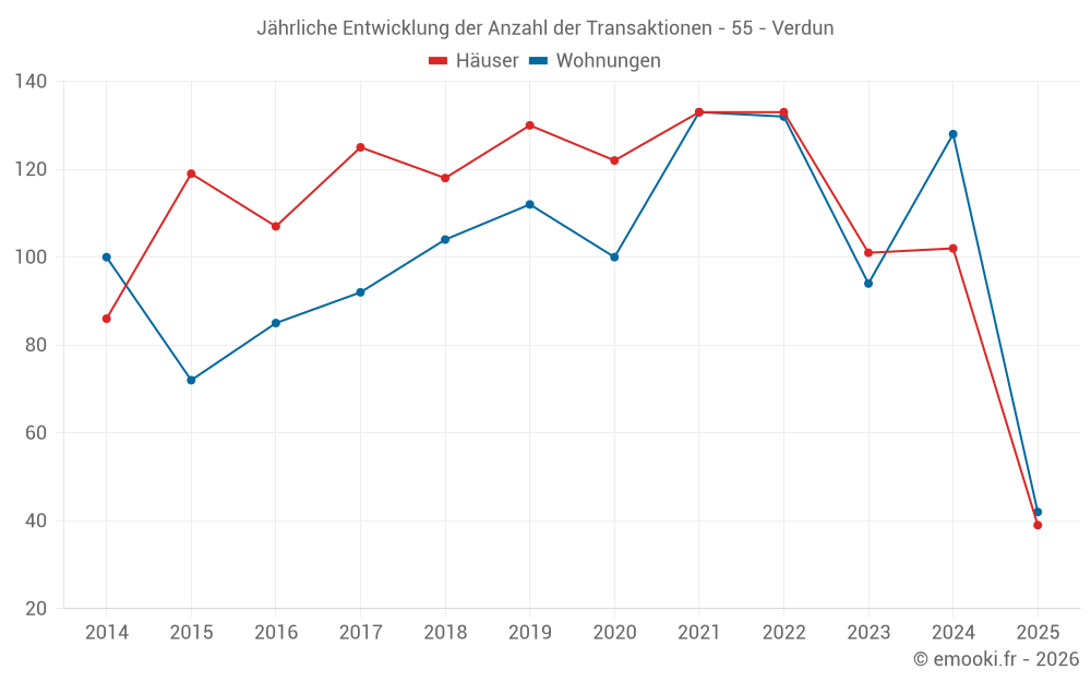 Der Durchschnittspreis auf den 39 Hausgeschäften der letzten 6 Monate in der Gemeinde Verdun betrug 1 474 € pro Quadratmeter für einen mittleren Immobilienwert von 143 000 €. Über diesen Zeitraum hinweg lagen 60% der Transaktionen zwischen 929 und 2 052 € pro Quadratmeter (vom 2. bis zum 8. Dezil).