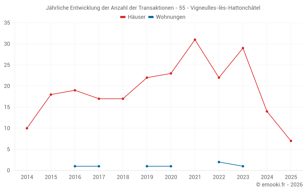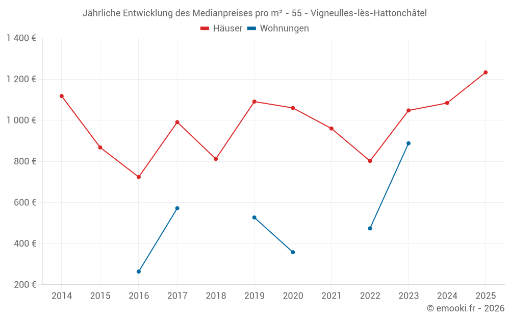 Der Durchschnittspreis auf den 17 Hausgeschäften der letzten 12 Monate in der Gemeinde Vigneulles-lès-Hattonchâtel betrug 1 233 € pro Quadratmeter für einen mittleren Immobilienwert von 140 000 €. Über diesen Zeitraum hinweg lagen 60% der Transaktionen zwischen 911 und 1 631 € pro Quadratmeter (vom 2. bis zum 8. Dezil).