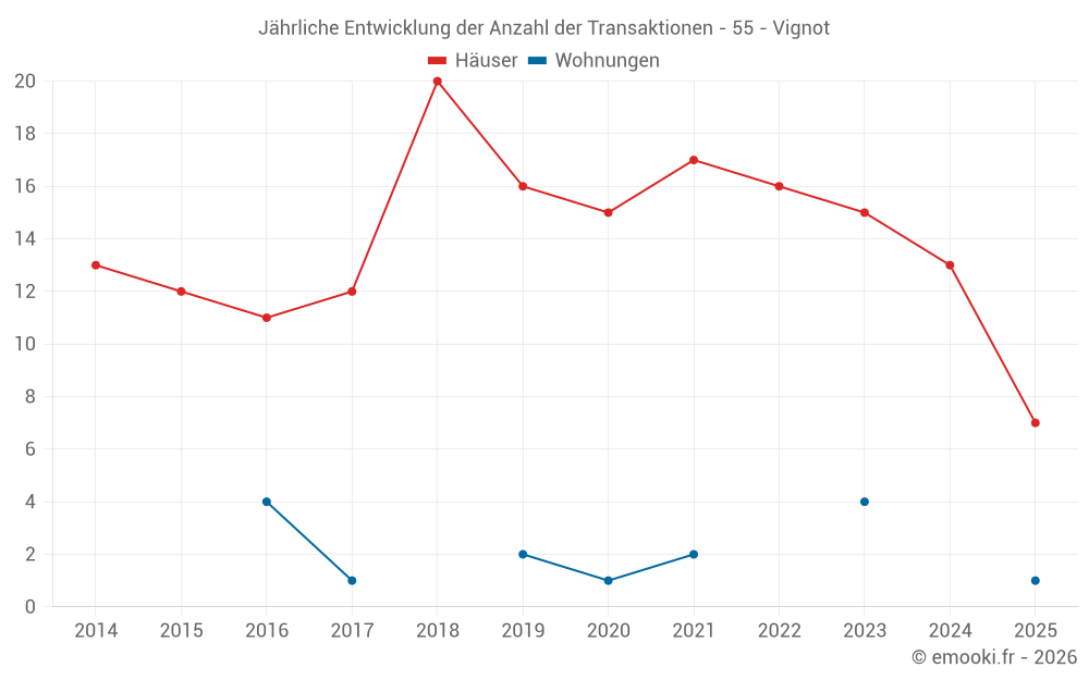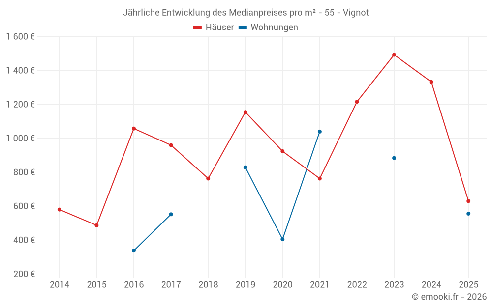 Der Durchschnittspreis auf den 28 Hausgeschäften der letzten 24 Monate in der Gemeinde Vignot betrug 1 090 € pro Quadratmeter für einen mittleren Immobilienwert von 109 750 €. Über diesen Zeitraum hinweg lagen 60% der Transaktionen zwischen 565 und 1 812 € pro Quadratmeter (vom 2. bis zum 8. Dezil).