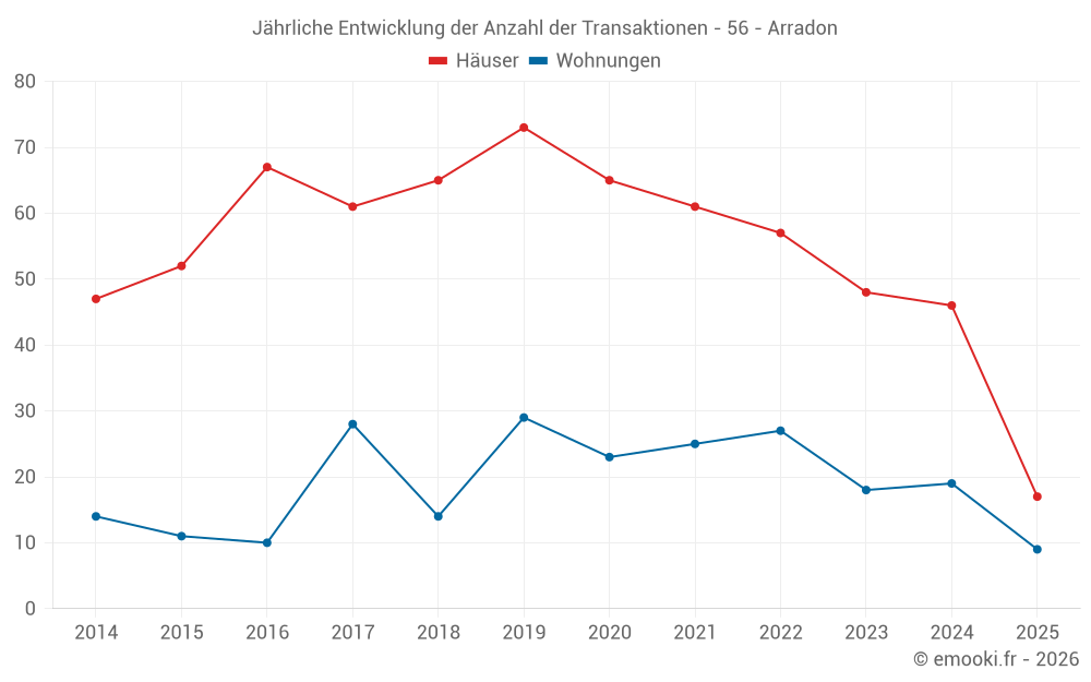 Der Durchschnittspreis auf den 47 Hausgeschäften der letzten 12 Monate in der Gemeinde Arradon betrug 5 000 € pro Quadratmeter für einen mittleren Immobilienwert von 545 000 €. Über diesen Zeitraum hinweg lagen 60% der Transaktionen zwischen 4 266 und 6 406 € pro Quadratmeter (vom 2. bis zum 8. Dezil).