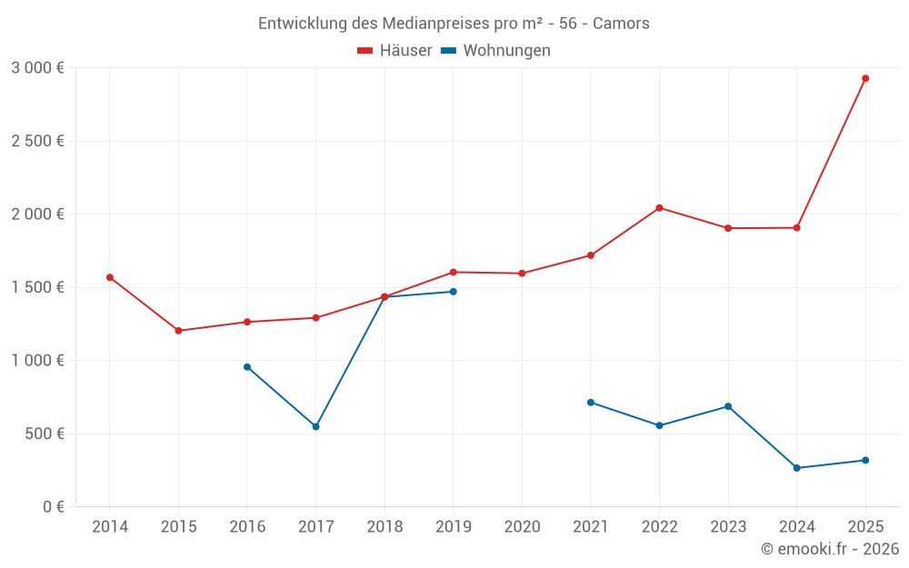 Der Durchschnittspreis auf den 39 Hausgeschäften der letzten 12 Monate in der Gemeinde Camors betrug 2 000 € pro Quadratmeter für einen mittleren Immobilienwert von 196 800 €. Über diesen Zeitraum hinweg lagen 60% der Transaktionen zwischen 1 619 und 2 957 € pro Quadratmeter (vom 2. bis zum 8. Dezil).