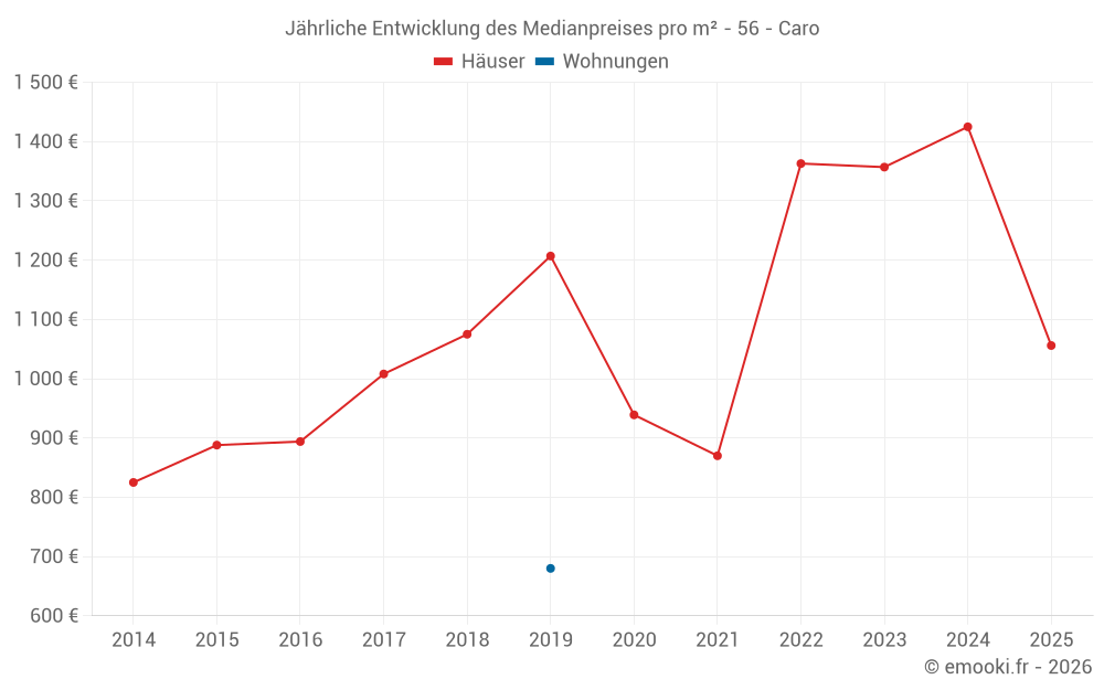 Der Durchschnittspreis auf den 22 Hausgeschäften der letzten 12 Monate in der Gemeinde Caro betrug 1 148 € pro Quadratmeter für einen mittleren Immobilienwert von 85 000 €. Über diesen Zeitraum hinweg lagen 60% der Transaktionen zwischen 698 und 1 662 € pro Quadratmeter (vom 2. bis zum 8. Dezil).