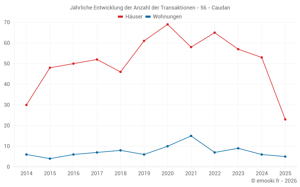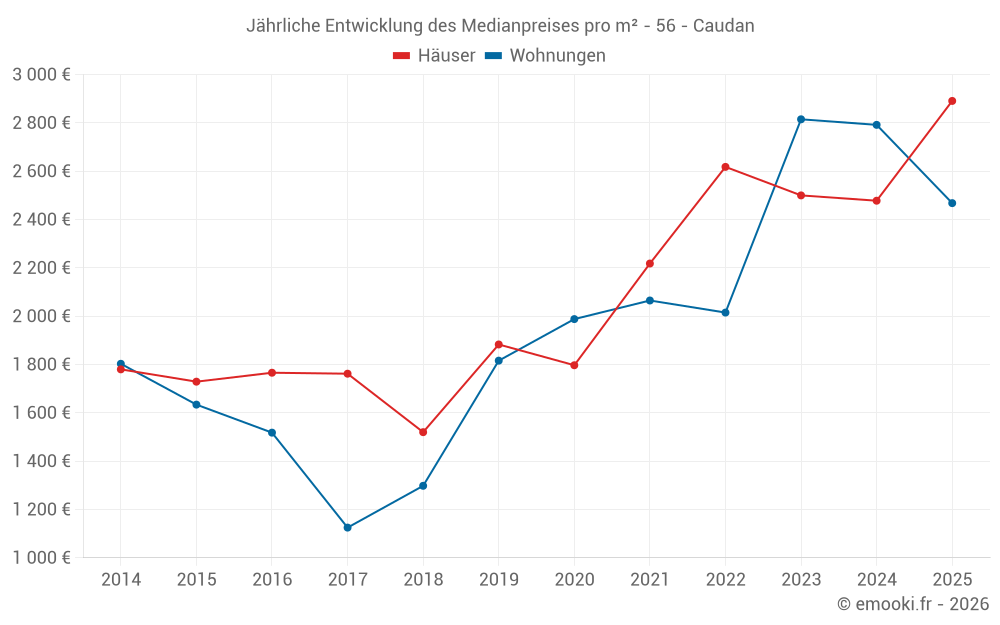 Der Durchschnittspreis auf den 23 Hausgeschäften der letzten 6 Monate in der Gemeinde Caudan betrug 2 891 € pro Quadratmeter für einen mittleren Immobilienwert von 338 000 €. Über diesen Zeitraum hinweg lagen 60% der Transaktionen zwischen 1 980 und 3 225 € pro Quadratmeter (vom 2. bis zum 8. Dezil).