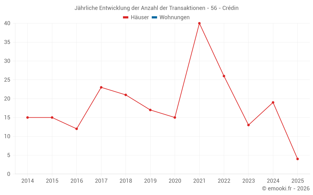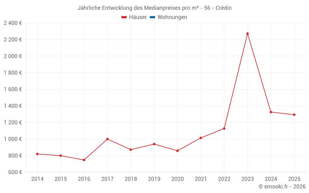 Der Durchschnittspreis auf den 17 Hausgeschäften der letzten 12 Monate in der Gemeinde Crédin betrug 1 371 € pro Quadratmeter für einen mittleren Immobilienwert von 122 010 €. Über diesen Zeitraum hinweg lagen 60% der Transaktionen zwischen 922 und 1 804 € pro Quadratmeter (vom 2. bis zum 8. Dezil).
