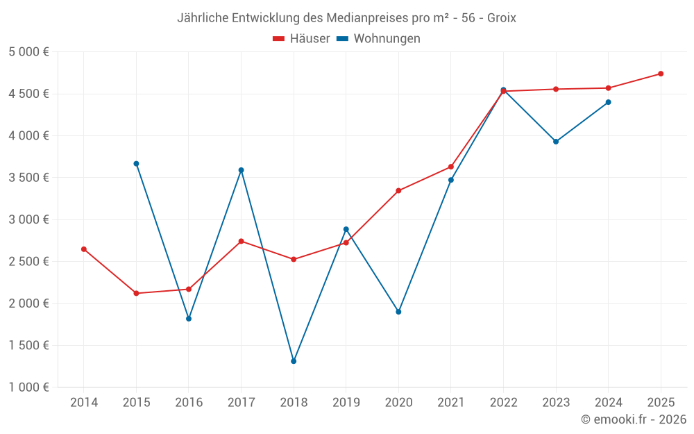 Der Durchschnittspreis auf den 24 Hausgeschäften der letzten 6 Monate in der Gemeinde Groix betrug 4 739 € pro Quadratmeter für einen mittleren Immobilienwert von 362 172 €. Über diesen Zeitraum hinweg lagen 60% der Transaktionen zwischen 3 563 und 6 215 € pro Quadratmeter (vom 2. bis zum 8. Dezil).