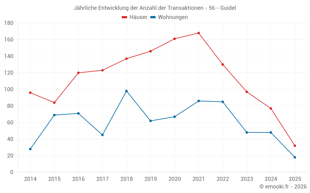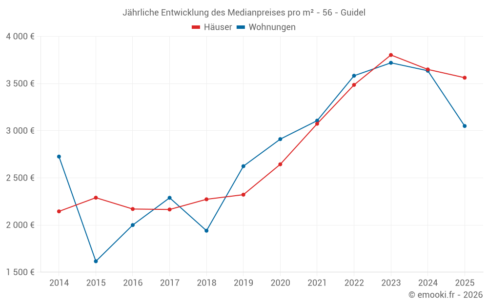 Der Durchschnittspreis auf den 32 Hausgeschäften der letzten 6 Monate in der Gemeinde Guidel betrug 3 562 € pro Quadratmeter für einen mittleren Immobilienwert von 312 500 €. Über diesen Zeitraum hinweg lagen 60% der Transaktionen zwischen 2 778 und 4 922 € pro Quadratmeter (vom 2. bis zum 8. Dezil).
