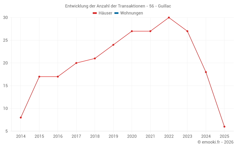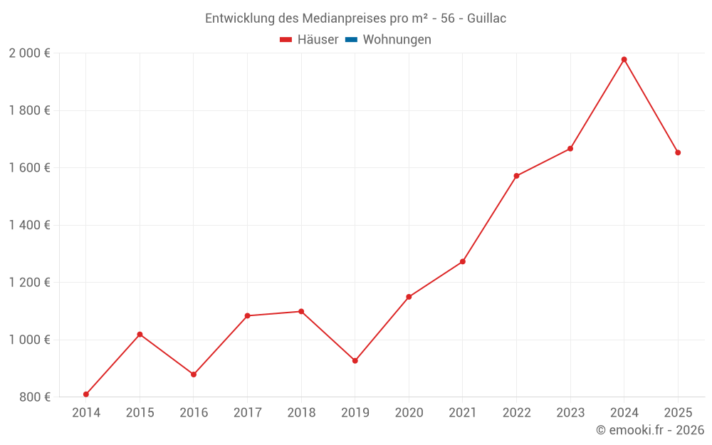 Der Durchschnittspreis auf den 45 Hausgeschäften der letzten 24 Monate in der Gemeinde Guillac betrug 1 757 € pro Quadratmeter für einen mittleren Immobilienwert von 161 000 €. Über diesen Zeitraum hinweg lagen 60% der Transaktionen zwischen 1 176 und 2 449 € pro Quadratmeter (vom 2. bis zum 8. Dezil).