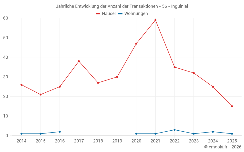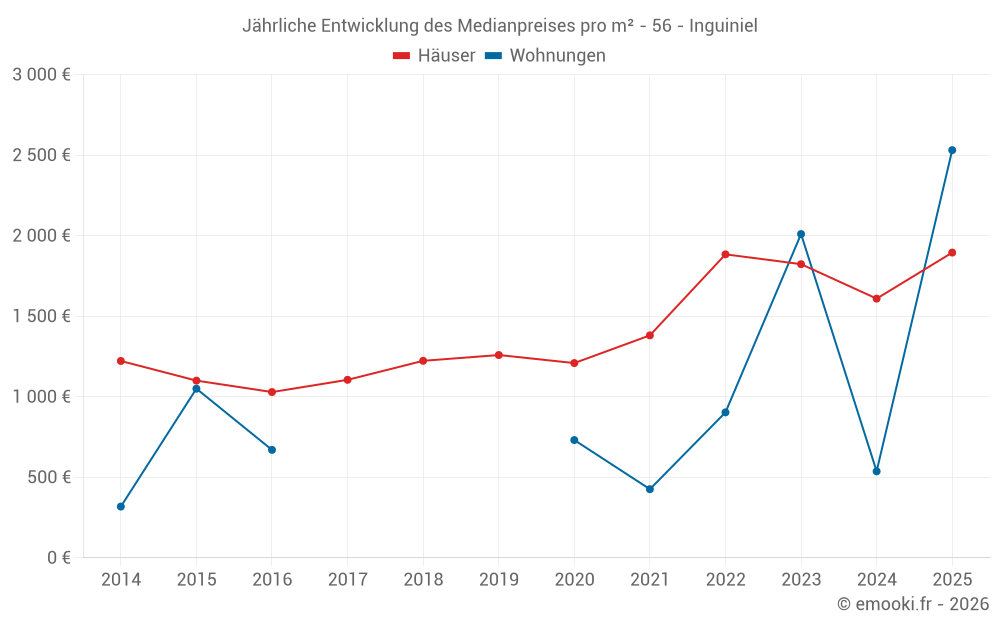 Der Durchschnittspreis auf den 22 Hausgeschäften der letzten 12 Monate in der Gemeinde Inguiniel betrug 1 792 € pro Quadratmeter für einen mittleren Immobilienwert von 173 000 €. Über diesen Zeitraum hinweg lagen 60% der Transaktionen zwischen 1 173 und 2 155 € pro Quadratmeter (vom 2. bis zum 8. Dezil).
