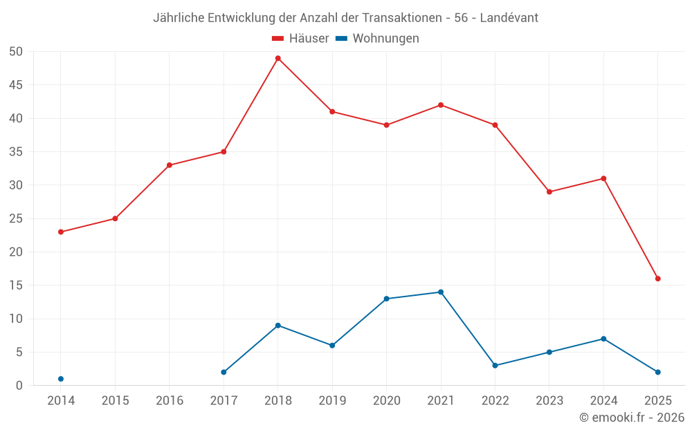 Der Durchschnittspreis auf den 14 Wohnungstransaktionen der letzten 24 Monate in der Gemeinde Landévant betrug 2 822 € pro Quadratmeter für einen mittleren Immobilienwert von 163 500 €. Über diesen Zeitraum hinweg lagen 60% der Transaktionen zwischen 2 600 und 3 219 € pro Quadratmeter (vom 2. bis zum 8. Dezil).