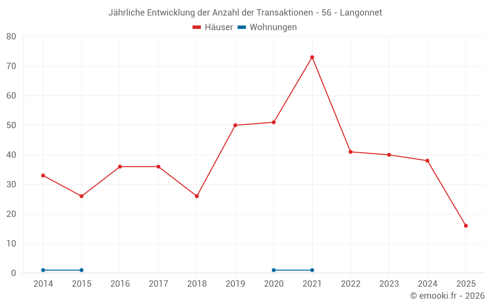 Der Durchschnittspreis auf den 37 Hausgeschäften der letzten 12 Monate in der Gemeinde Langonnet betrug 1 223 € pro Quadratmeter für einen mittleren Immobilienwert von 90 000 €. Über diesen Zeitraum hinweg lagen 60% der Transaktionen zwischen 705 und 1 762 € pro Quadratmeter (vom 2. bis zum 8. Dezil).