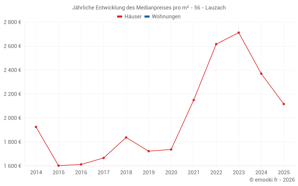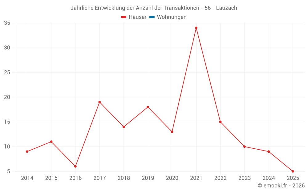 Der Durchschnittspreis auf den 16 Hausgeschäften der letzten 24 Monate in der Gemeinde Lauzach betrug 2 448 € pro Quadratmeter für einen mittleren Immobilienwert von 280 000 €. Über diesen Zeitraum hinweg lagen 60% der Transaktionen zwischen 1 935 und 3 297 € pro Quadratmeter (vom 2. bis zum 8. Dezil).