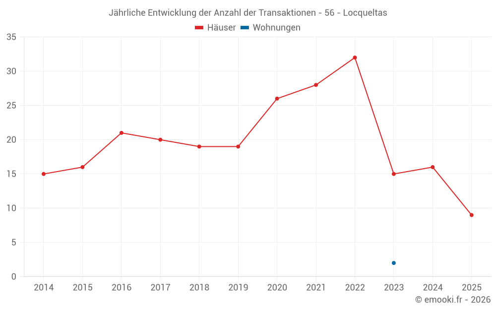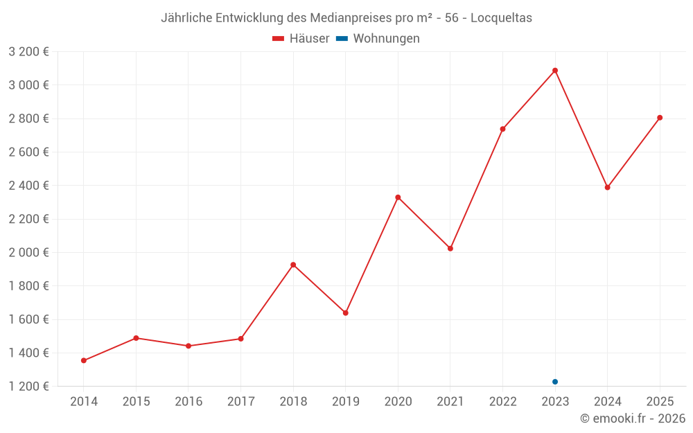 Der Durchschnittspreis auf den 16 Hausgeschäften der letzten 12 Monate in der Gemeinde Locqueltas betrug 2 500 € pro Quadratmeter für einen mittleren Immobilienwert von 269 250 €. Über diesen Zeitraum hinweg lagen 60% der Transaktionen zwischen 1 870 und 2 992 € pro Quadratmeter (vom 2. bis zum 8. Dezil).