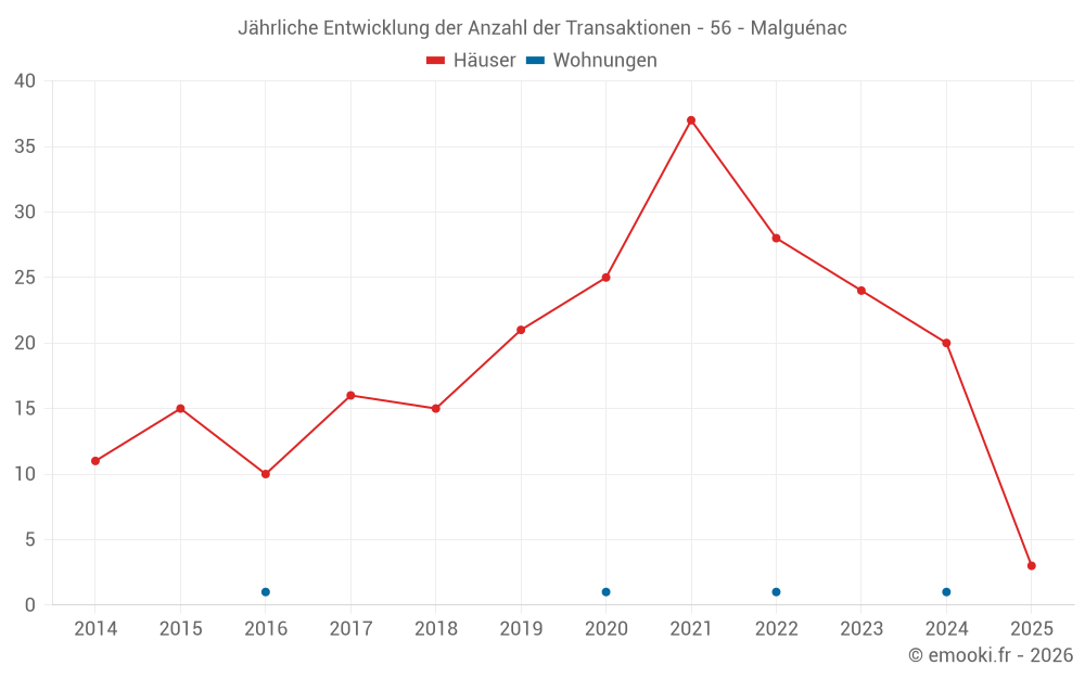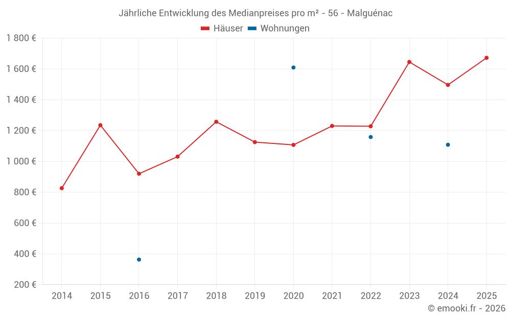 Der Durchschnittspreis auf den 34 Hausgeschäften der letzten 24 Monate in der Gemeinde Malguénac betrug 1 572 € pro Quadratmeter für einen mittleren Immobilienwert von 163 000 €. Über diesen Zeitraum hinweg lagen 60% der Transaktionen zwischen 1 128 und 2 049 € pro Quadratmeter (vom 2. bis zum 8. Dezil).