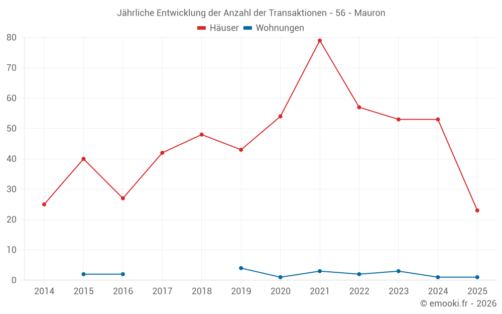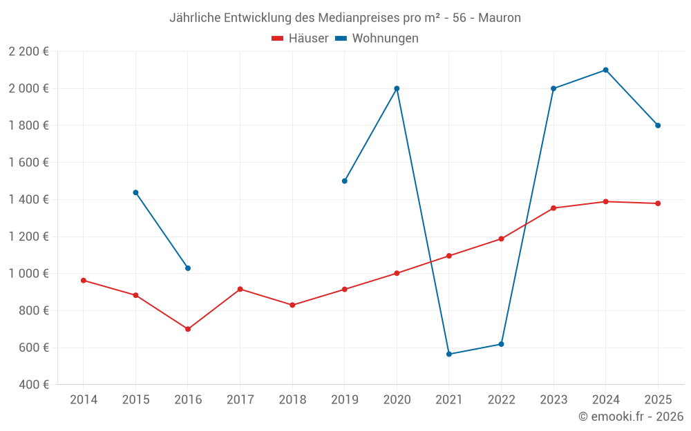 Der Durchschnittspreis auf den 23 Hausgeschäften der letzten 6 Monate in der Gemeinde Mauron betrug 1 379 € pro Quadratmeter für einen mittleren Immobilienwert von 120 000 €. Über diesen Zeitraum hinweg lagen 60% der Transaktionen zwischen 943 und 1 692 € pro Quadratmeter (vom 2. bis zum 8. Dezil).