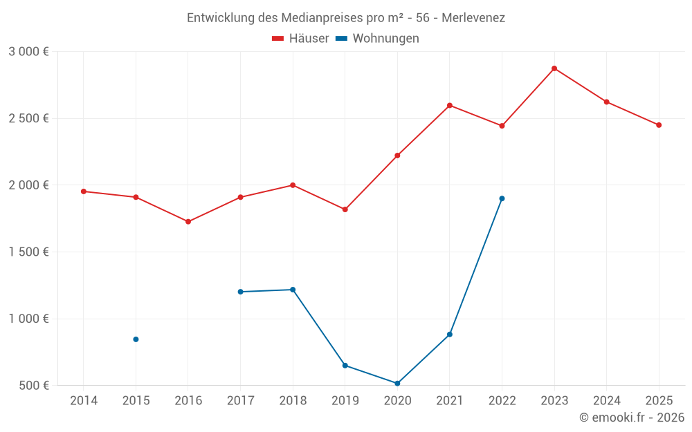 Der Durchschnittspreis auf den 23 Hausgeschäften der letzten 12 Monate in der Gemeinde Merlevenez betrug 2 778 € pro Quadratmeter für einen mittleren Immobilienwert von 295 000 €. Über diesen Zeitraum hinweg lagen 60% der Transaktionen zwischen 2 216 und 3 323 € pro Quadratmeter (vom 2. bis zum 8. Dezil).