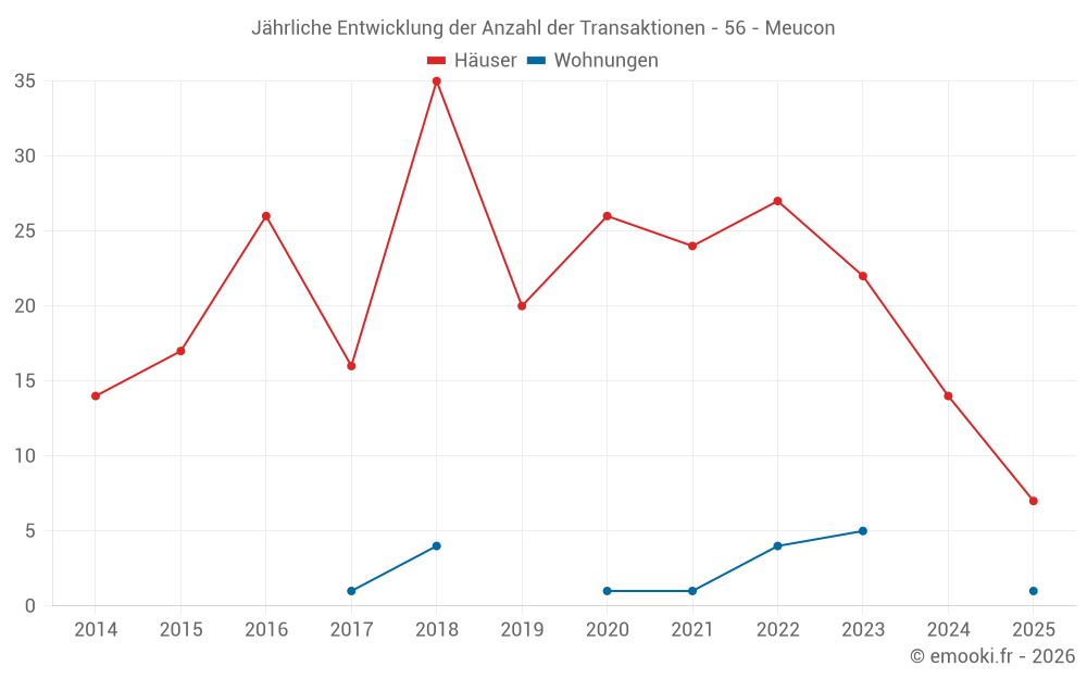 Der Durchschnittspreis auf den 33 Hausgeschäften der letzten 24 Monate in der Gemeinde Meucon betrug 2 834 € pro Quadratmeter für einen mittleren Immobilienwert von 297 430 €. Über diesen Zeitraum hinweg lagen 60% der Transaktionen zwischen 2 075 und 3 457 € pro Quadratmeter (vom 2. bis zum 8. Dezil).
