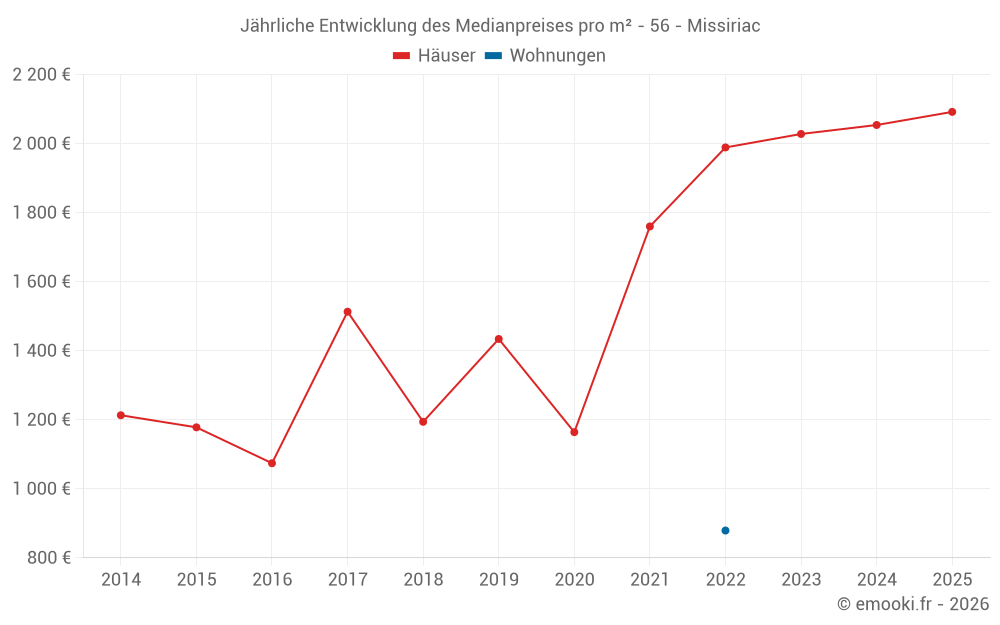 Der Durchschnittspreis auf den 27 Hausgeschäften der letzten 24 Monate in der Gemeinde Missiriac betrug 2 083 € pro Quadratmeter für einen mittleren Immobilienwert von 170 000 €. Über diesen Zeitraum hinweg lagen 60% der Transaktionen zwischen 1 561 und 2 382 € pro Quadratmeter (vom 2. bis zum 8. Dezil).