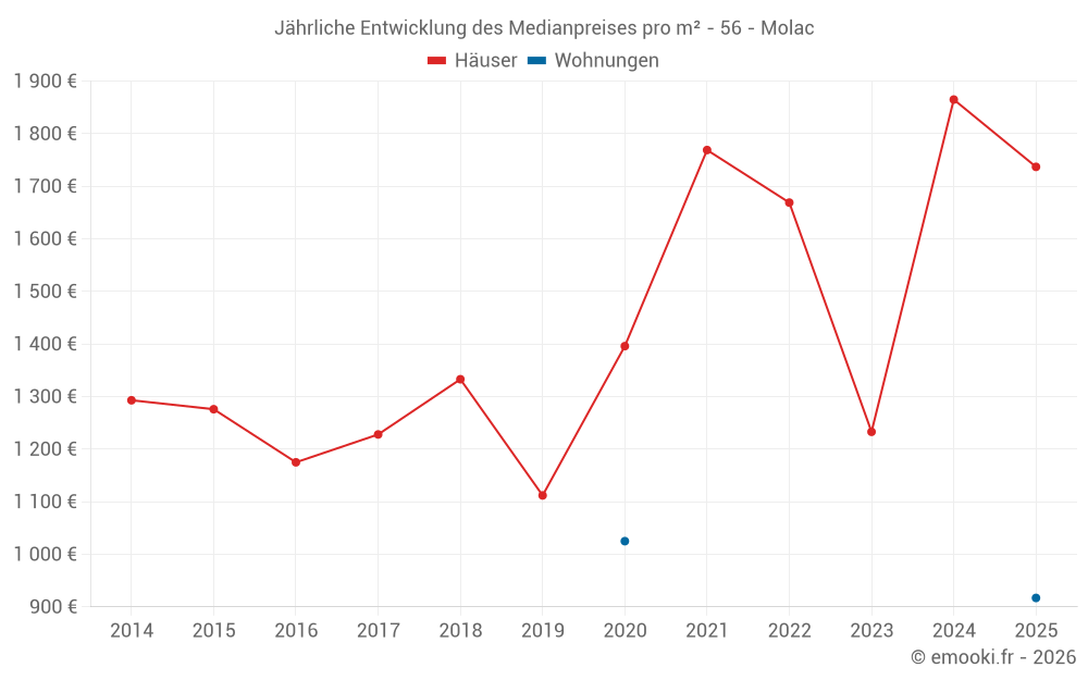 Der Durchschnittspreis auf den 17 Hausgeschäften der letzten 12 Monate in der Gemeinde Molac betrug 1 737 € pro Quadratmeter für einen mittleren Immobilienwert von 232 000 €. Über diesen Zeitraum hinweg lagen 60% der Transaktionen zwischen 999 und 2 646 € pro Quadratmeter (vom 2. bis zum 8. Dezil).