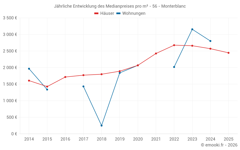Der Durchschnittspreis auf den 29 Hausgeschäften der letzten 12 Monate in der Gemeinde Monterblanc betrug 2 458 € pro Quadratmeter für einen mittleren Immobilienwert von 270 000 €. Über diesen Zeitraum hinweg lagen 60% der Transaktionen zwischen 1 844 und 2 957 € pro Quadratmeter (vom 2. bis zum 8. Dezil).