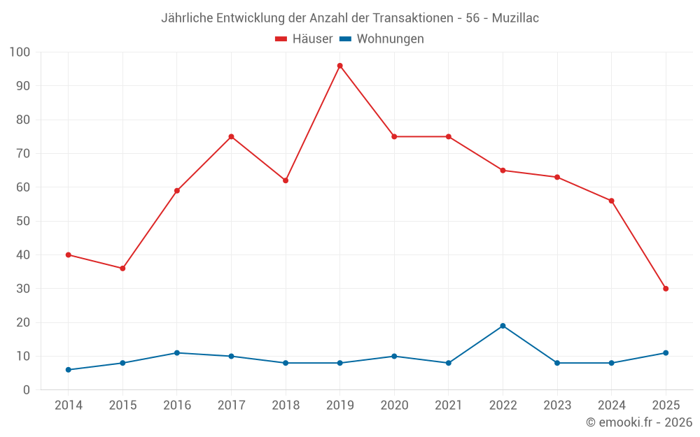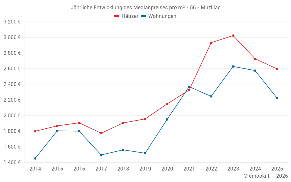 Der Durchschnittspreis auf den 30 Hausgeschäften der letzten 6 Monate in der Gemeinde Muzillac betrug 2 596 € pro Quadratmeter für einen mittleren Immobilienwert von 217 500 €. Über diesen Zeitraum hinweg lagen 60% der Transaktionen zwischen 1 438 und 3 261 € pro Quadratmeter (vom 2. bis zum 8. Dezil).