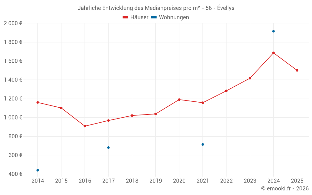 Der Durchschnittspreis auf den 23 Hausgeschäften der letzten 6 Monate in der Gemeinde Évellys betrug 1 500 € pro Quadratmeter für einen mittleren Immobilienwert von 130 000 €. Über diesen Zeitraum hinweg lagen 60% der Transaktionen zwischen 1 040 und 1 872 € pro Quadratmeter (vom 2. bis zum 8. Dezil).