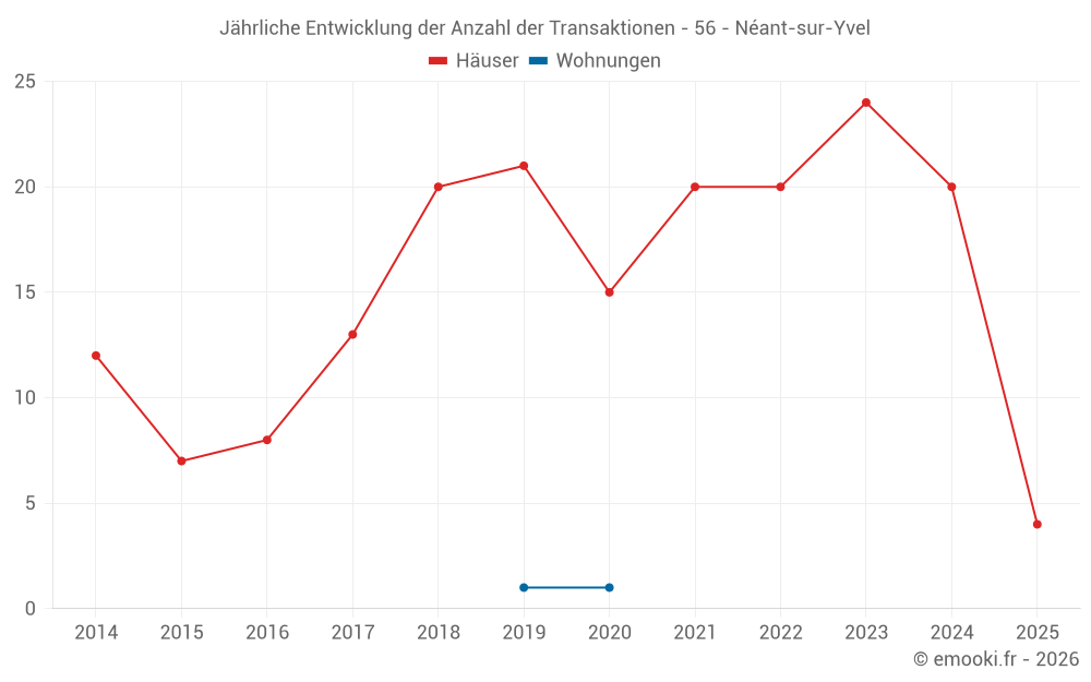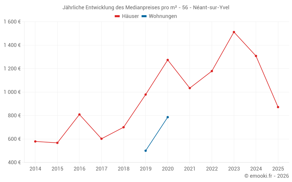 Der Durchschnittspreis auf den 38 Hausgeschäften der letzten 24 Monate in der Gemeinde Néant-sur-Yvel betrug 1 448 € pro Quadratmeter für einen mittleren Immobilienwert von 135 500 €. Über diesen Zeitraum hinweg lagen 60% der Transaktionen zwischen 783 und 1 939 € pro Quadratmeter (vom 2. bis zum 8. Dezil).